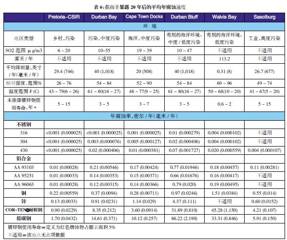 表3至表6的數據來自于日本、巴拿馬、Kure 海灘(北卡萊羅納州)和南非的試驗地點??衫眠@些數據在類似環境中選擇適當的金屬材料,進行生命周期成本分析。