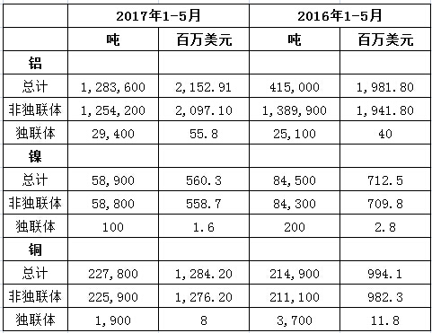 以下為俄羅斯聯(lián)邦海關(guān)服務(wù)機(jī)構(gòu)(FCS)提供的2017年1-5月鋁、鎳和銅出口量數(shù)據(jù):